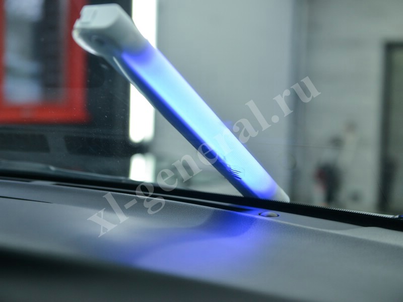 - Поверх «запечатки» на лобовое стекло мы фиксируем ультрафиолетовую лампу и ждем несколько минут пока полимер затвердеет.