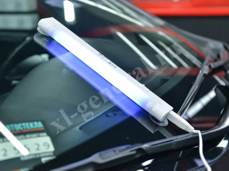 - Поверх «запечатки» на лобовое стекло мы фиксируем ультрафиолетовую лампу и ждем несколько минут пока полимер затвердеет.